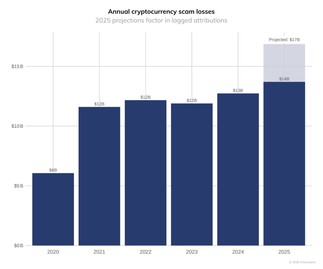 Um relatório publicado pela Chainalysis nesta terça-feira (13) aponta que US$ 17 bilhões em criptomoedas foram roubados por golpistas em 2025. Os destaques ficam para golpes de personificação, quando fingem ser outra pessoa ou empresa, e a lucratividade no uso de Inteligência Artificial (IA) em fraudes.