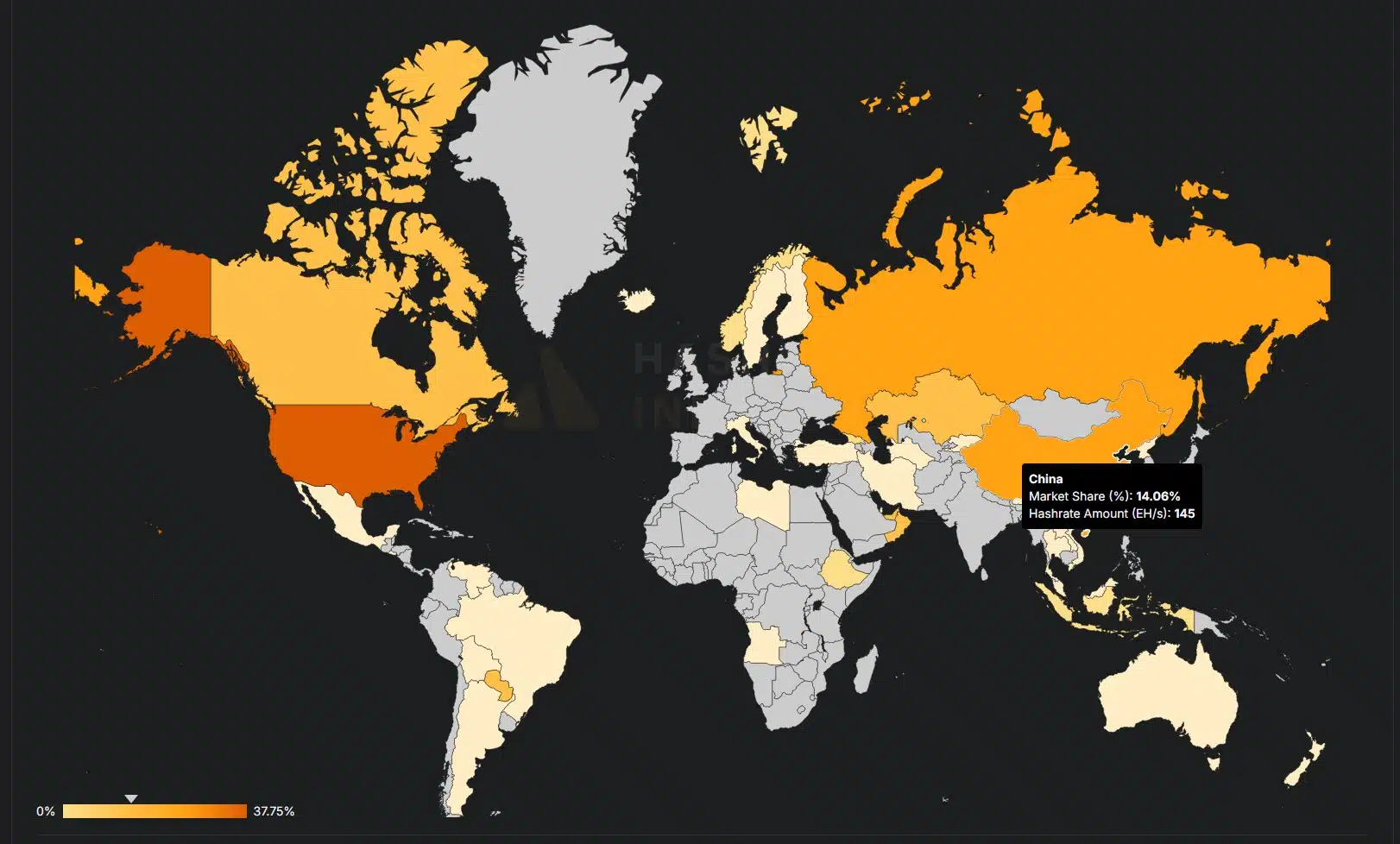 Segundo os dados do Hashrate Index, a China hoje é responsável por 14% do hashrate do Bitcoin. Na sua frente estão somente EUA com 37,7% e Rússia com 15,5%.