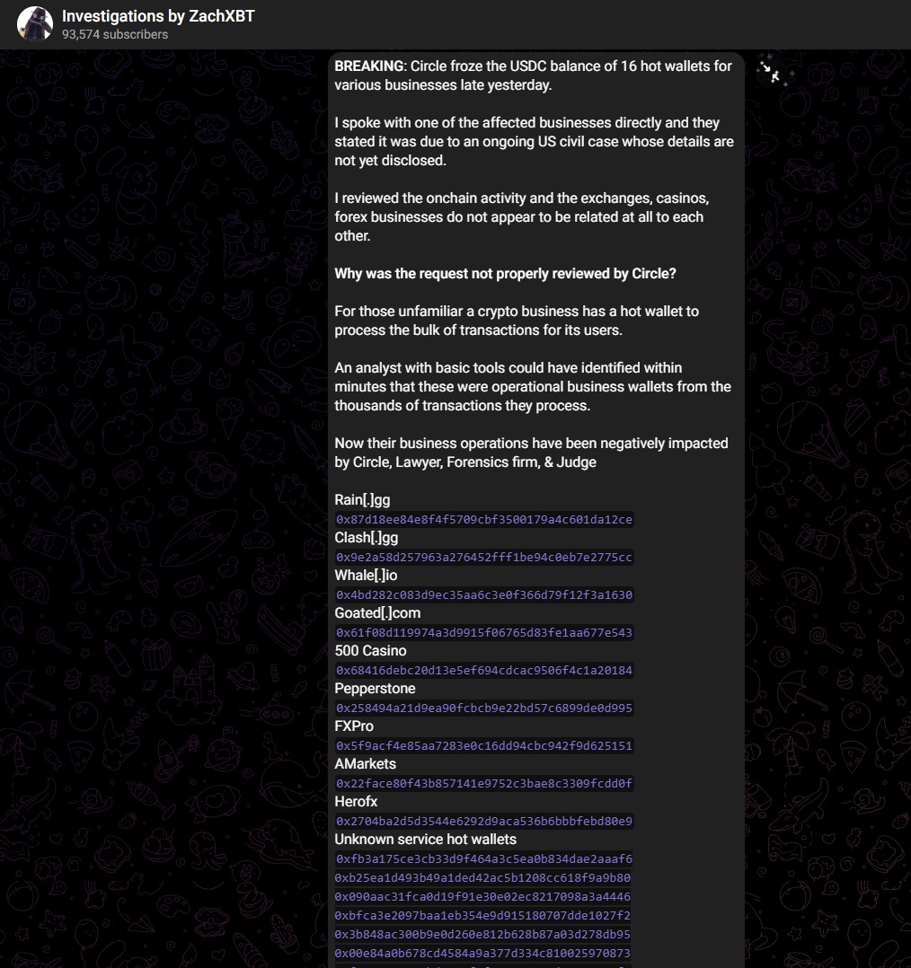 “URGENTE: a Circle congelou o saldo em USDC de 16 hot wallets de diferentes empresas no fim do dia de ontem”, escreveu ZachXBT em seu canal no Telegram.