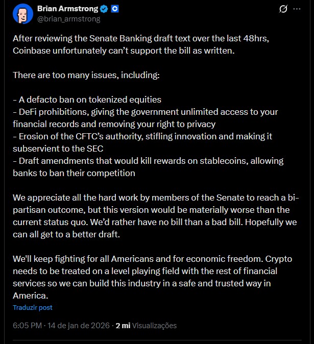 Brian Armstrong, CEO da Coinbase, vai contra o Clarity Act nos EUA, apontando que texto atual está cheio de problemas. Fonte: X.