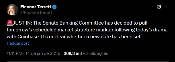 “O Comitê Bancário do Senado decidiu retirar da pauta a sessão de amanhã sobre a estrutura de mercado, após a confusão de hoje envolvendo a Coinbase. Ainda não está claro se uma nova data foi definida.”