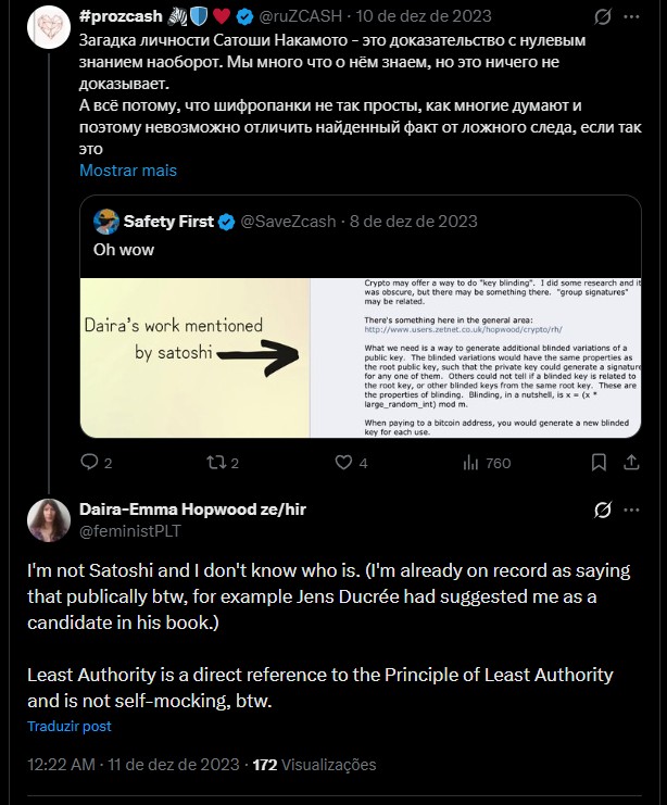 Isso porque além de ter sido um dos principais desenvolvedores da Zcash, uma criptomoeda focada em privacidade, Hopwood também é referenciado publicamente por Nakamoto ainda em 2010.