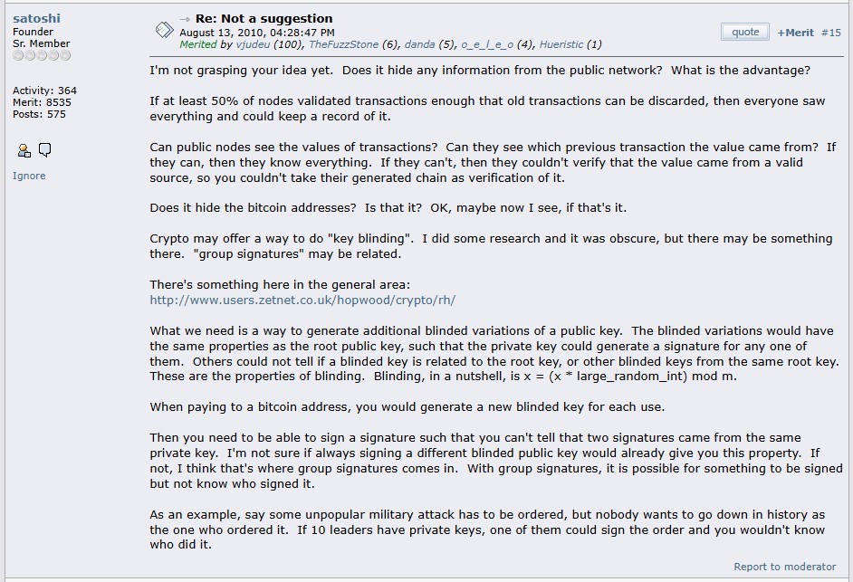 Tentando resolver esse enigma, a comunidade encontrou uma postagem de agosto de 2010 onde o desenvolvedor deixa um link externo sobre um texto técnico sobre como aumentar a privacidade do Bitcoin.