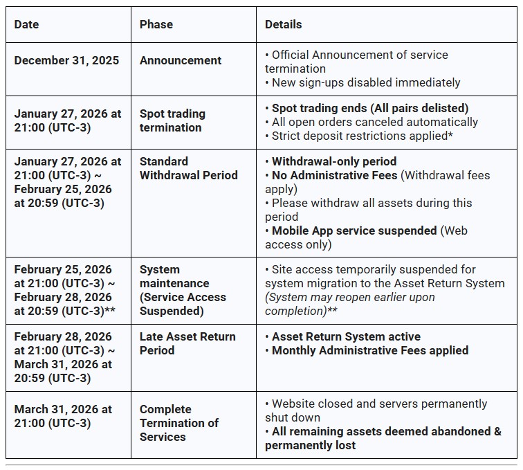 “Recomendamos fortemente que todos os usuários realizem seus saques antes desse prazo, a fim de evitar qualquer possível perda de ativos ou a cobrança de taxas administrativas.”