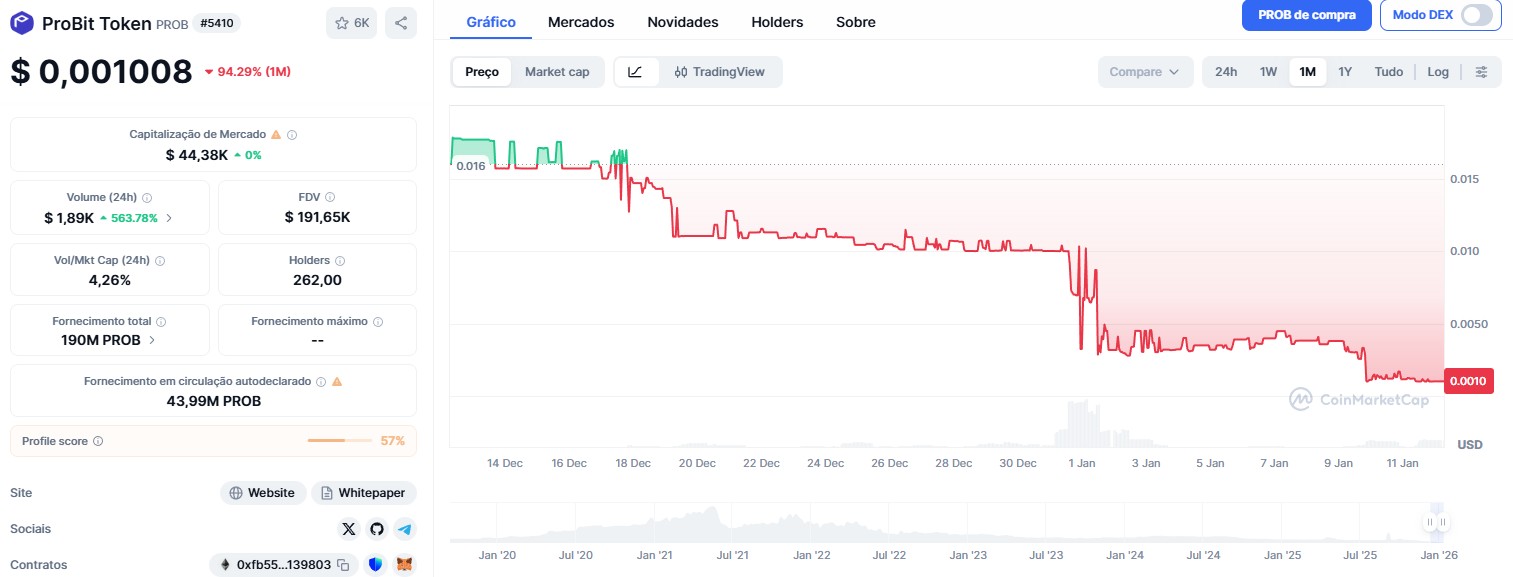 Outro destaque fica para o ProBit Token (PROB). Isso porque a criptomoeda opera em queda de 94,3% no último mês, refletindo o encerramento das atividades da corretora.