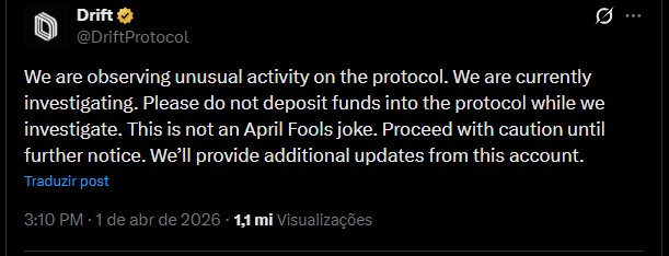 “Estamos observando atividade incomum no protocolo. Estamos investigando no momento. Por favor, não deposite fundos no protocolo enquanto a investigação estiver em andamento”, escreveu o Drift.