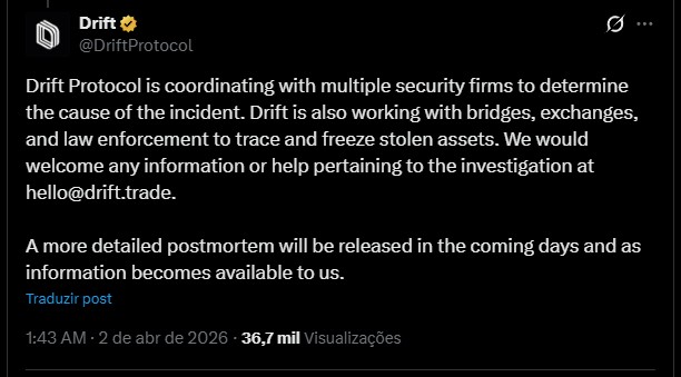 “A Drift Protocol está coordenando com várias empresas de segurança para determinar a causa do incidente. A Drift também está trabalhando com bridges, corretoras e autoridades para rastrear e congelar os ativos roubados. Qualquer informação ou ajuda relacionada à investigação será bem-vinda pelo e-mail hello@drift.trade.”
