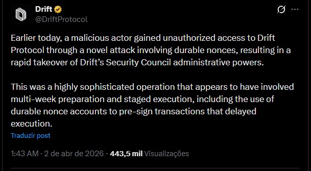 “Hoje mais cedo, um ator malicioso obteve acesso não autorizado ao Drift Protocol por meio de um ataque inovador envolvendo nonces duráveis, resultando na rápida tomada das funções administrativas do Conselho de Segurança do Drift. Foi uma operação altamente sofisticada que parece ter envolvido semanas de preparação e execução em etapas, incluindo o uso de contas de nonce durável para pré-assinar transações que retardaram a execução.”