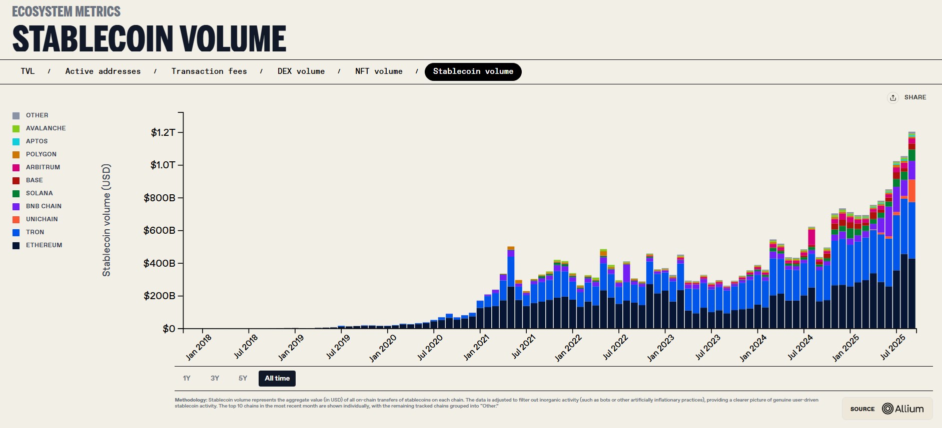 Outro gráfico que pode ser acompanhado em tempo real mostra que o volume de transações de stablecoins continua crescendo para novas máximas mês a mês.