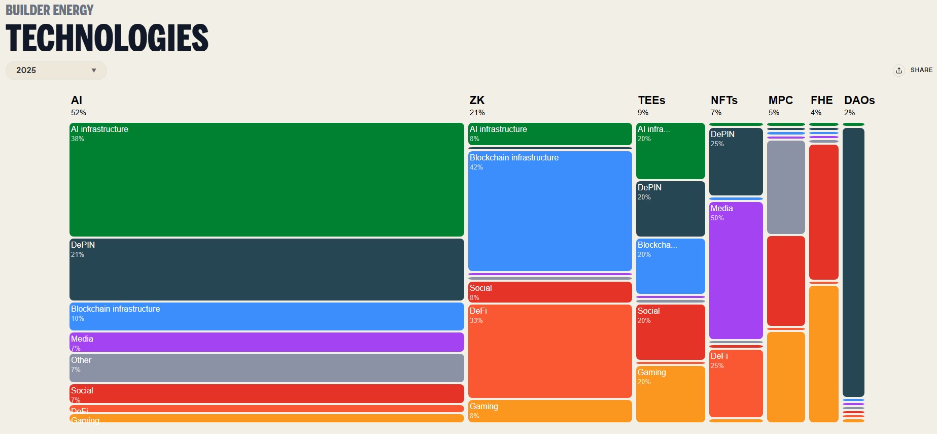 Outra página mostra um forte interesse em tecnologias como IA (inteligência artificial), ZK (Zero-Knowledge), TEEs (ambientes de execução confiáveis), NFTs, MPC (computação multipartidária segura), FHE (criptografia homomórfica completa) e DAOs (organizações autônomas descentralizadas).