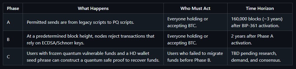 • Fase B: torna gastos ECDSA/Schnorr inválidos, impedindo todo gasto de fundos em UTXOs vulneráveis à computação quântica. Isso é acionado por um “flag day” amplamente divulgado cinco anos após a ativação.