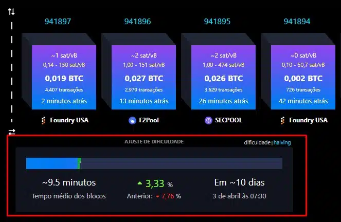 Como comparação, quando a China baniu a mineração em 2021, a dificuldade passou por três reajustes negativos de cerca de 13%, 16% e 28% em um curto período de tempo.