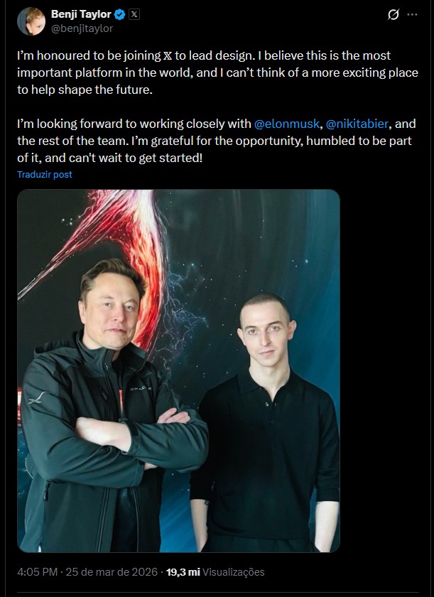 Já nesta quarta-feira (25), Benji Taylor anunciou que estará se juntando ao X como Líder de Design.