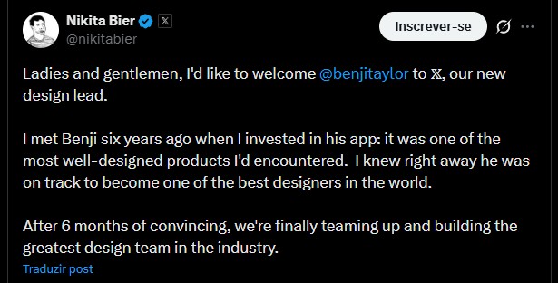 “Senhoras e senhores, gostaria de dar as boas-vindas a @benjitaylor ao X, nosso novo design lead”, iniciou Nikita.