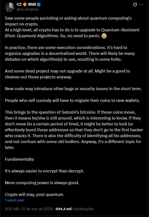 Enquanto alguns defendem que essas moedas de Satoshi, hoje avaliadas em US$ 75 bilhões, fiquem livres para serem roubadas com computadores quânticos, CZ defende que seria melhor bloqueá-las para sempre, opnião compartilhada por Michael Saylor.