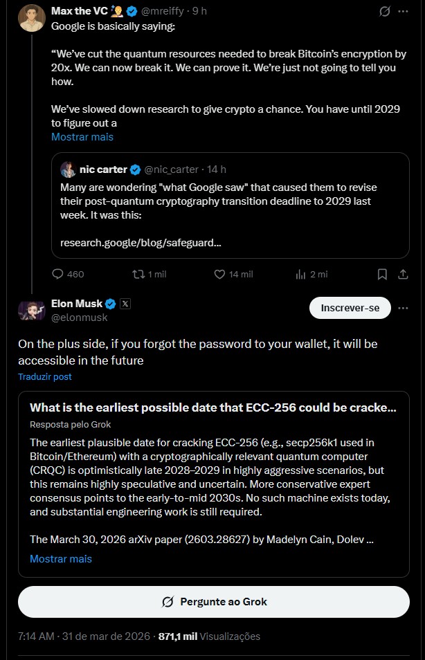 “Muitos estão se perguntando “o que o Google viu” que os levou a revisar, na semana passada, o prazo de transição para a criptografia pós-quântica para 2029”, disse Carter, deixando um link para o novo estudo publicado nesta terça-feira (31).