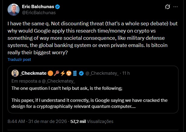 “Sem desconsiderar a ameaça (isso é um debate à parte), por que o Google aplicaria esse tempo e dinheiro de pesquisa em cripto, em vez de algo com consequências sociais muito maiores, como sistemas de defesa militar, o sistema bancário global ou até e-mails privados? O bitcoin é realmente a maior preocupação deles?”