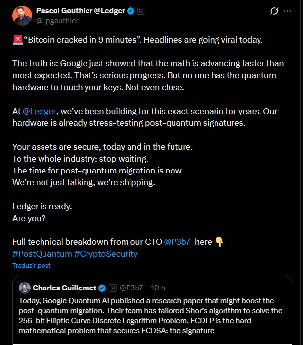 Pascal Gauthier, CEO da Ledger, foi além, pedindo que desenvolvedores acelerem a busca por soluções, visto que a matemática está avançando mais rápido do que a maioria esperava.
