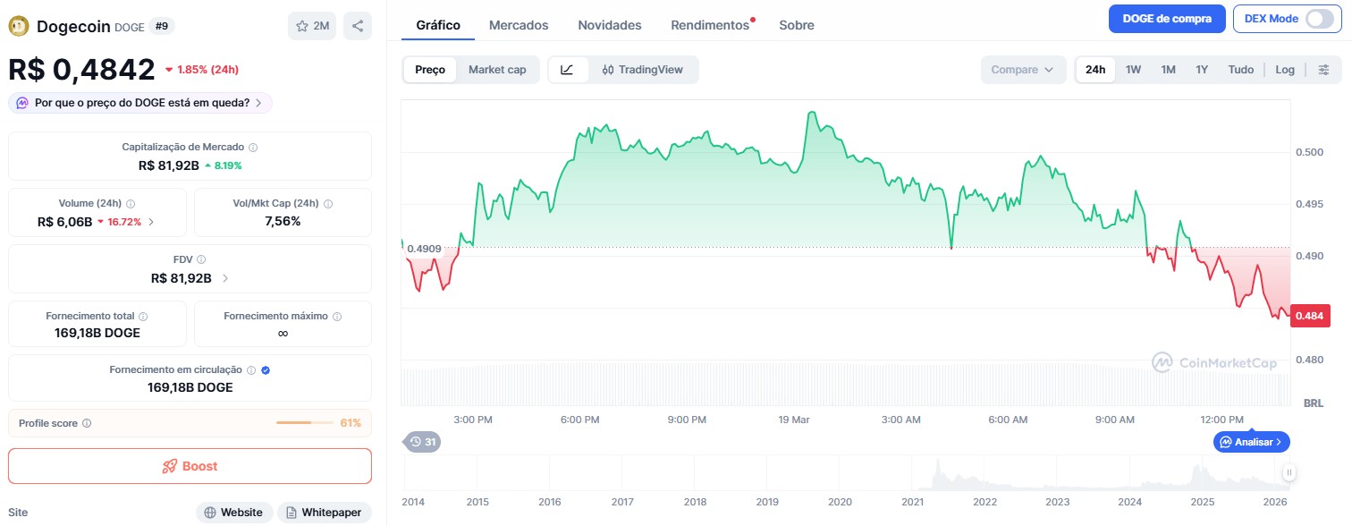 Dados do CoinMarketCap mostram que a DOGE opera em queda de 1,8% nas últimas 24 horas, acompanhando o movimento de baixa do Bitcoin devido ao temor mundial sobre a volta da inflação.