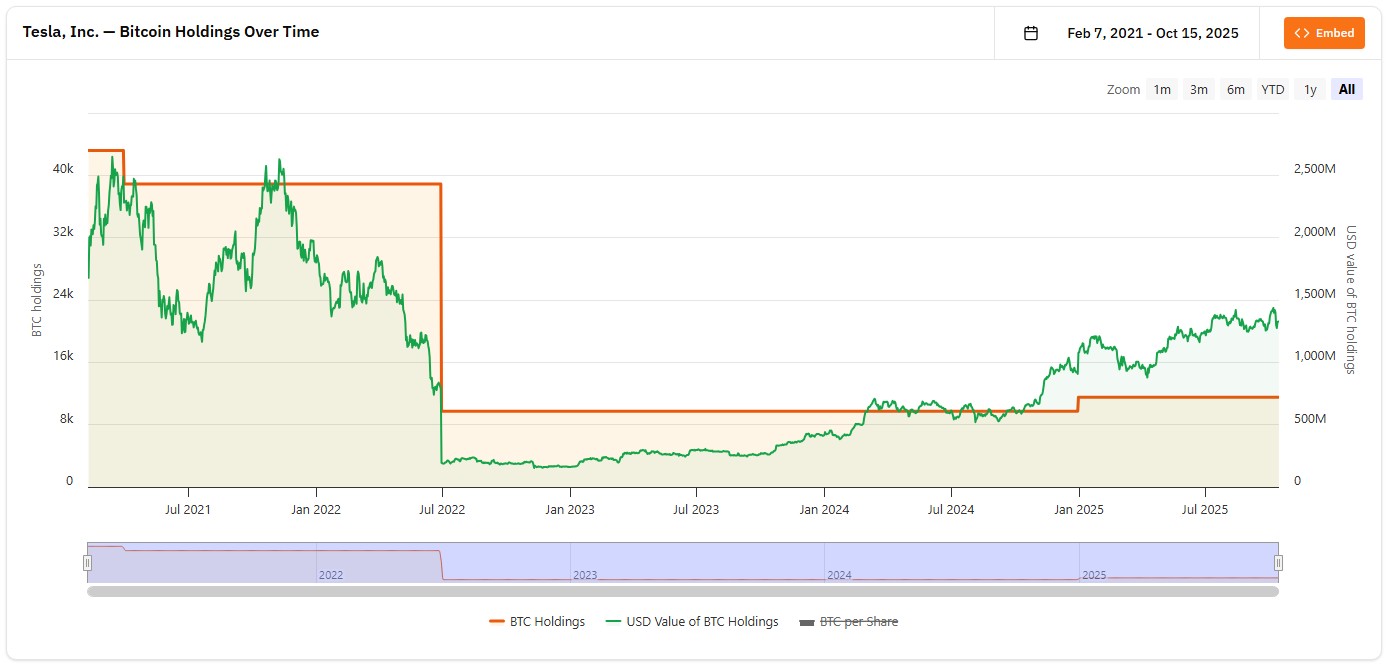 Histórico de bitcoins da Tesla (em laranja), junto ao valor de suas moedas (em verde). Fonte: Bitcoin Treasuries.