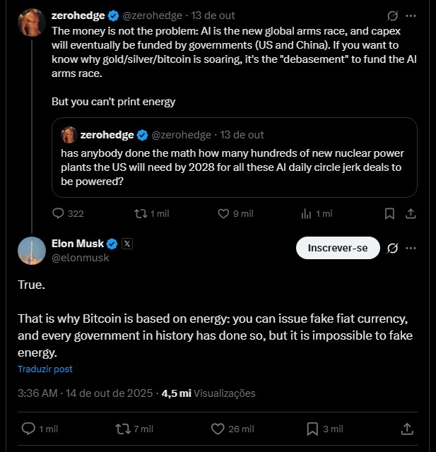 “Se você quer saber por que o ouro, a prata e o bitcoin estão disparando, é por causa da “desvalorização” necessária para financiar a corrida armamentista da IA. Mas você não pode imprimir energia.”