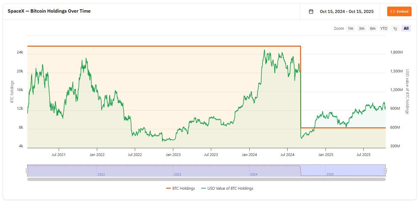 Histórico de bitcoins da SpaceX. Fonte: Bitcoin Treasuries.