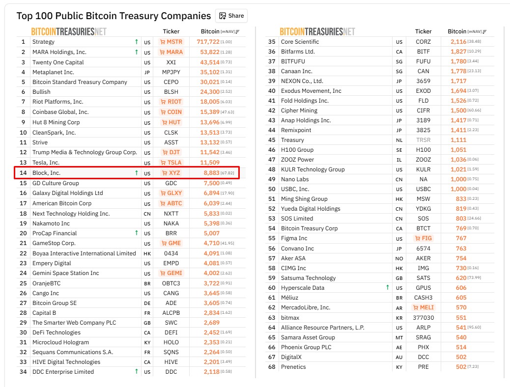 Embora a Block não siga a mesma estratégia da Strategy, hoje a empresa de Jack Dorsey mantém 8.883 bitcoins em caixa, mantendo a 14ª maior posição entre empresas públicas.