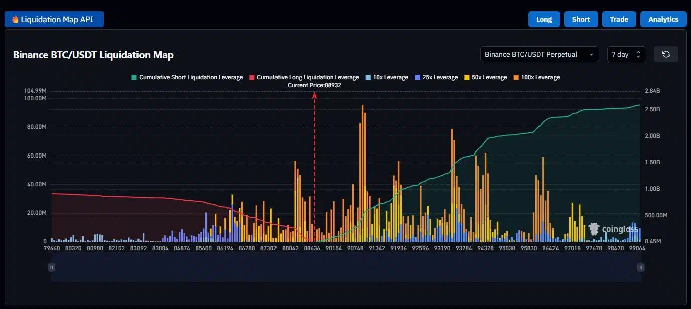 No liquidation map, observa-se liquidez acima dos US$ 91 mil, que podem ser capturados em movimentos de alívio no curto prazo. Ainda assim, é fundamental ter cautela com operações em long. Manter posições compradas nesse cenário aumenta significativamente o risco, especialmente sem uma confirmação clara de reversão de tendência.