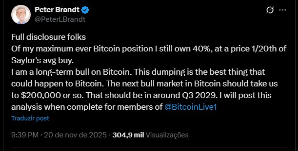 Em outra postagem, Brandt afirmou que irá parar de postar sobre o Bitcoin no X, justificando que a rede social se tornou um lugar tóxico e cheio de trolls. “Vou voltar ao meu primeiro amor — os mercados futuros que opero profissionalmente desde 1975”, comentou.