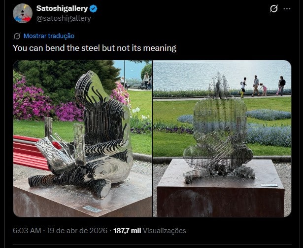 Uma estátua em homenagem a Satoshi Nakamoto, criador do Bitcoin, voltou a ser depredada em Lugano, na Suíça, nesta semana. Fotos publicadas nas redes sociais pela artista do projeto mostram a obra danificada.