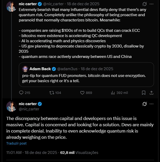Reagindo aos comentários de Nic Carter e Adam Back, o desenvolvedor afirmou que a ameaça não é iminente, mas que a comunidade precisa estar atenta. Na conversa, o brasileiro também cita a preocupação com outras vulnerabilidades mais importantes no momento.