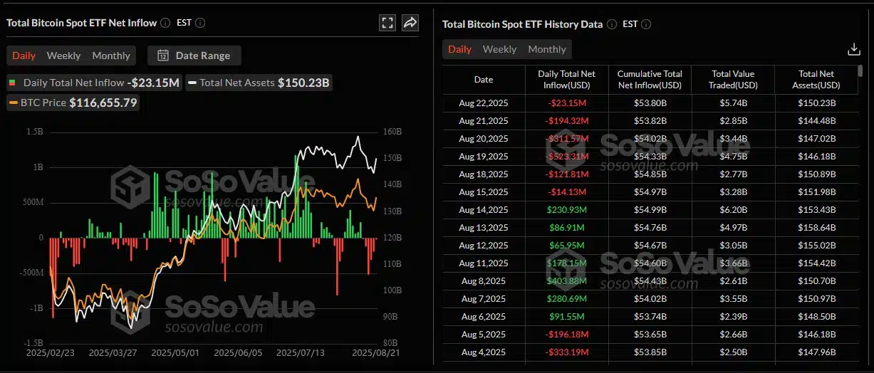 Os ETFs americanos de Bitcoin tiveram saídas de US$ 23,2 milhões nesta sexta-feira (22), completando seis dias consecutivos no vermelho. A criptomoeda é negociada a US$ 115.000 no momento desta redação, em breve queda após esboçar uma reação com o discurso de Powell em Jackson Hole.