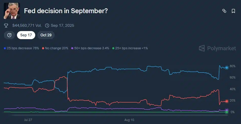 Segundo a Ferramenta CME FedWatch, há 75% de chances de um corte de 0,25%. Na Polymarket, 78% das apostas também apontam para essa mesma decisão, uma mudança após as falas de Powell.
