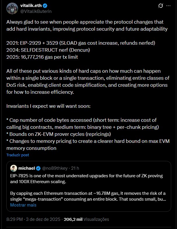 Falando sobre atualizações de 2021, 2024 e agora de 2025 com a Fusaka, o desenvolvedor notou que “todas essas medidas colocam vários tipos de limites rígidos sobre quanto pode acontecer dentro de um único bloco ou de uma única transação, eliminando classes inteiras de riscos de DoS, permitindo simplificação do código dos clientes e criando mais opções para aumentar a eficiência”.