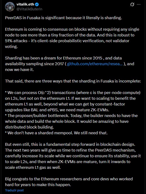 Além de prometer novidades sobre o PeerDAS nos próximos dois anos, Buterin finalizou agradecendo sua equipe.
