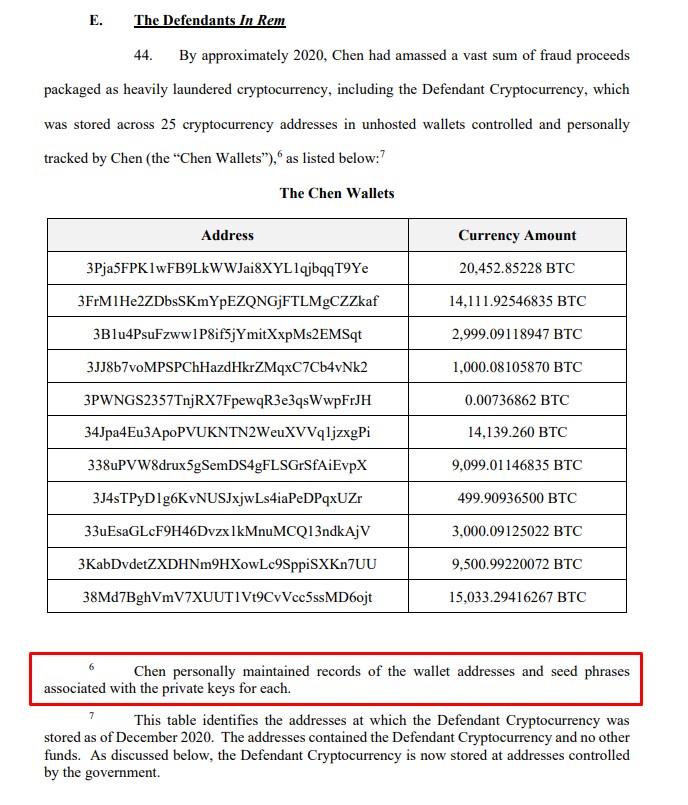 Mais próximo de uma explicação é a frase: “Chen pessoalmente mantinha registros dos endereços de carteiras e das frases-semente associadas às chaves privadas de cada uma”, um possível indício que o governo americano teve acesso a esses dados virtualmente, assim como aconteceu com documentos e fotos sobre torturas e espancamento citados em outro trecho.