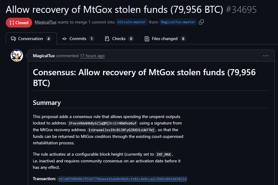 “Esta proposta adiciona uma regra de consenso que permite gastar os outputs não gastos bloqueados no endereço 1FeexV6bAHb8ybZjqQMjJrcCrHGW9sb6uF usando uma assinatura do endereço de recuperação da MtGox 1zUrwsmiJxs19c8SJ8FyGZRXD1zUW77Wj, para que os fundos possam ser devolvidos aos credores da MtGox por meio do processo de reabilitação já existente supervisionado pelo tribunal”, inicia o texto.