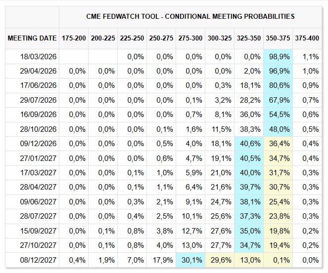 Segundo a Ferramenta CME FedWatch, o mercado está esperando um único corte de juros em 2026 durante a reunião de dezembro. No entanto, os cenários podem mudar rapidamente dependendo do que acontece no Oriente Médio.