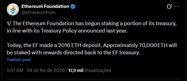 “Hoje, a EF fez um depósito de 2.016 ETH. Aproximadamente 70.000 ETH serão colocados em staking, com as recompensas direcionadas de volta para o tesouro da EF.”