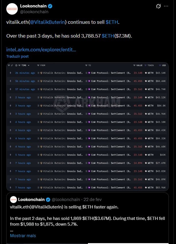 “vitalik.eth (@VitalikButerin) continua vendendo $ETH. Nos últimos 3 dias, ele vendeu 3.788,57 $ETH (US$ 7,3 milhões).”