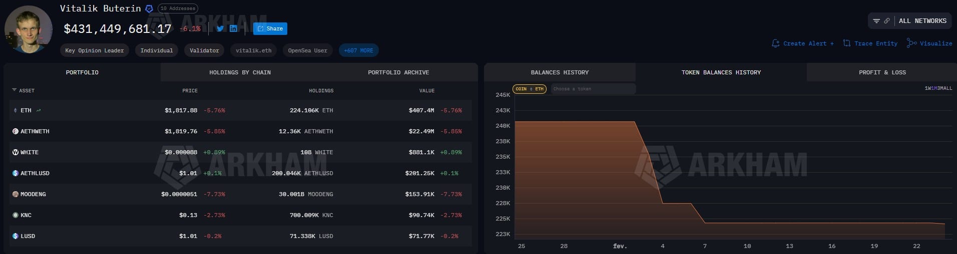 Por outro lado, Vitalik Buterin está despejando parte de suas moedas no mercado. Dados da Arkham mostram que o fundador do projeto já vendeu cerca de 17 mil ETH (US$ 30,8 milhões) no mês de fevereiro.