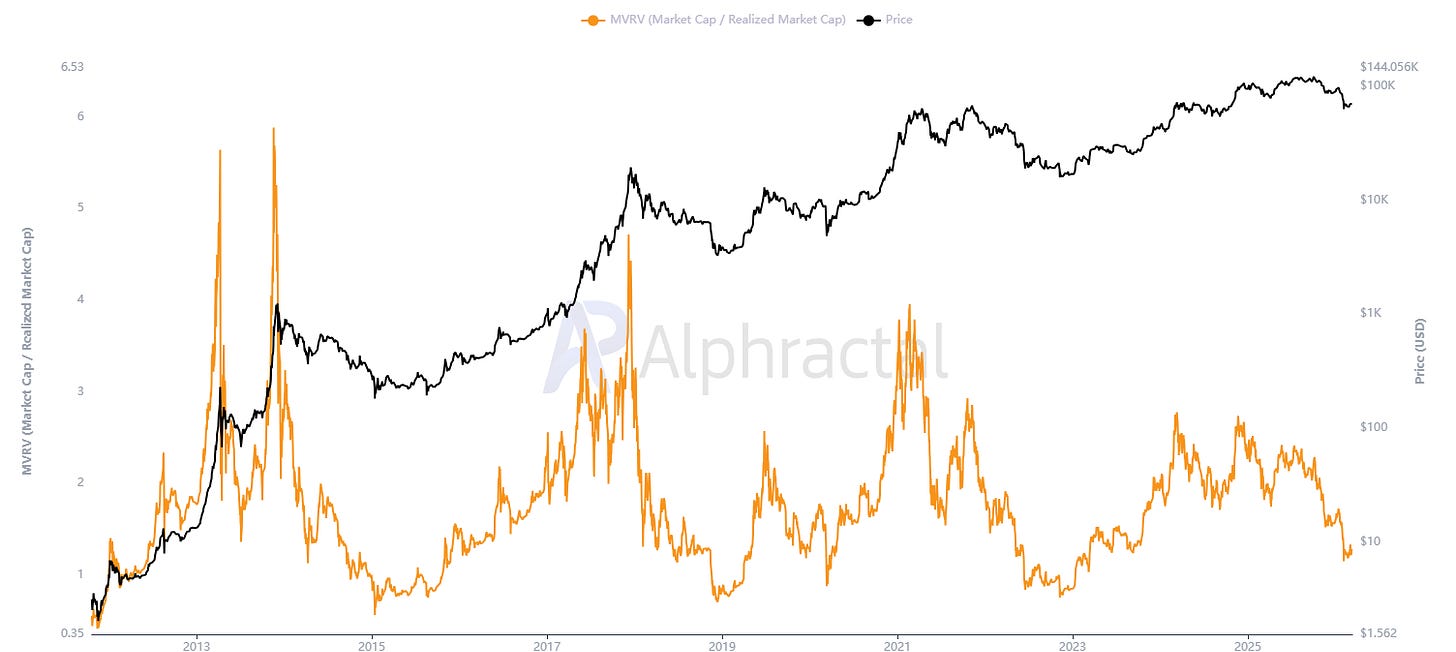 Esse indicador ajuda a avaliar o quanto o preço de mercado está acima ou próximo do custo médio pago pelos investidores. Historicamente, fundos de ciclo ocorreram quando o MVRV caiu para a faixa entre aproximadamente 0,7 e 1,0, indicando que o preço de mercado estava próximo ou abaixo do custo médio da rede.