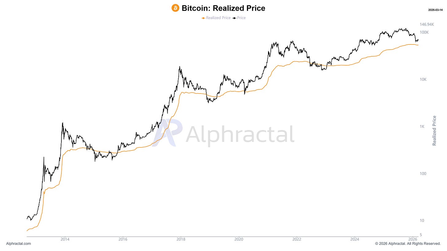 Outra métrica amplamente utilizada é o Realized Price (Preço Realizado). O Preço Realizado representa o preço médio pago por todos os bitcoins atualmente em circulação. Para calcular esse valor, cada unidade de bitcoin é contabilizada com base no preço da última vez em que foi movimentada na blockchain.