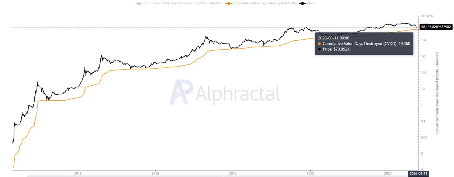 Quando esses bitcoins finalmente são transferidos, ocorre o chamado Coin Days Destroyed (CDD, ou Dias de Moeda Destruídos). Movimentos envolvendo moedas antigas costumam carregar informação econômica relevante, pois geralmente refletem decisões de investidores de longo prazo.