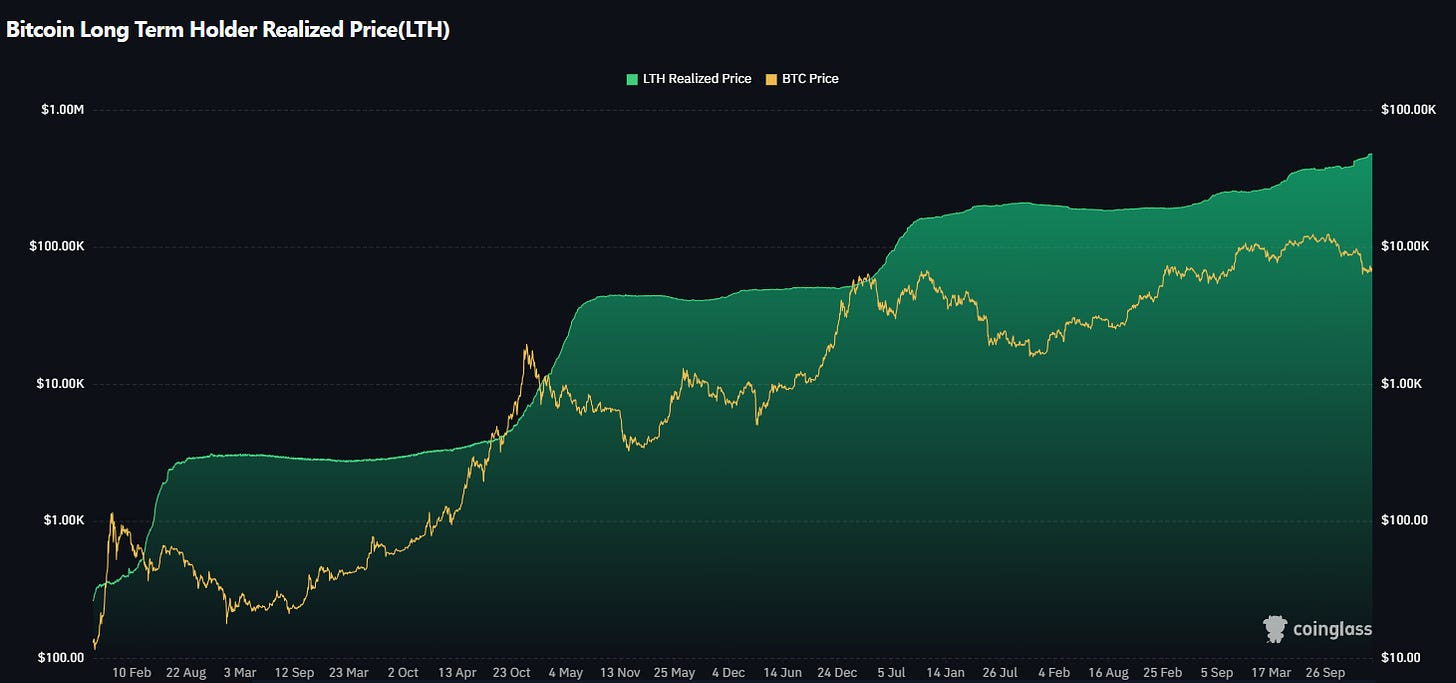 No gráfico, a linha amarela representa o preço do Bitcoin, enquanto a área verde representa o Preço Realizado dos detentores de longo prazo. Historicamente, observa-se que o preço frequentemente encontra suporte próximo ou ligeiramente abaixo desse nível, especialmente durante fases de capitulação.