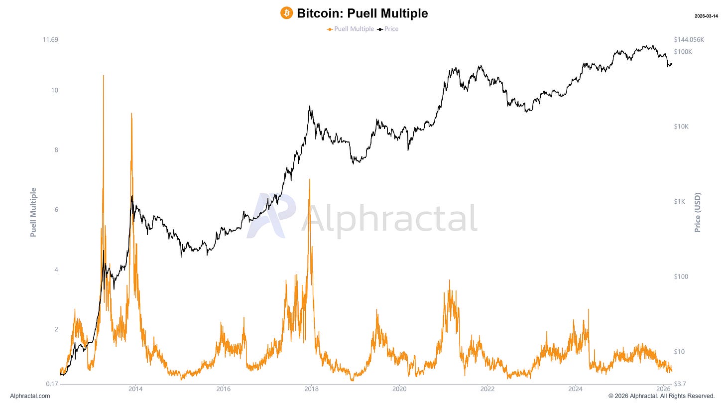No gráfico, a linha preta representa o preço do Bitcoin, enquanto a linha laranja representa o Puell Multiple. Historicamente, observa-se que os momentos em que o indicador cai para níveis muito baixos coincidem com períodos de forte compressão de receita para os mineradores.