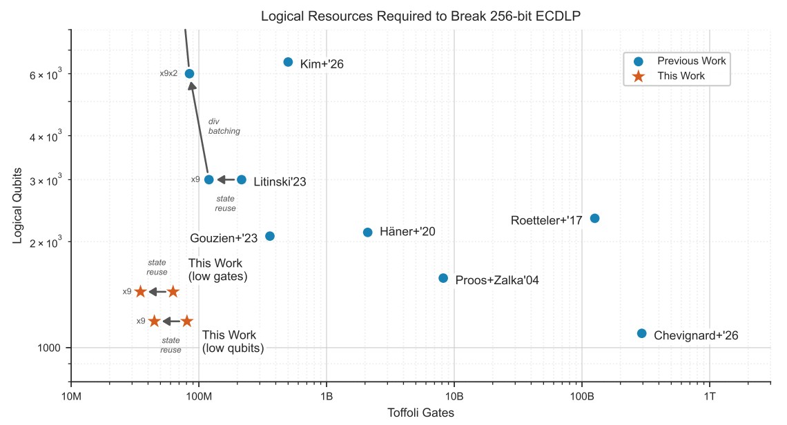 Logo na introdução, os pesquisadores revelam que uma curva elíptica de 256 bits pode ser quebrada por um computador quântico com 1200 qubits lógicos e 90 milhões de portas Toffoli ou então 1450 qubits lógicos e 70 milhões de portas Toffoli.