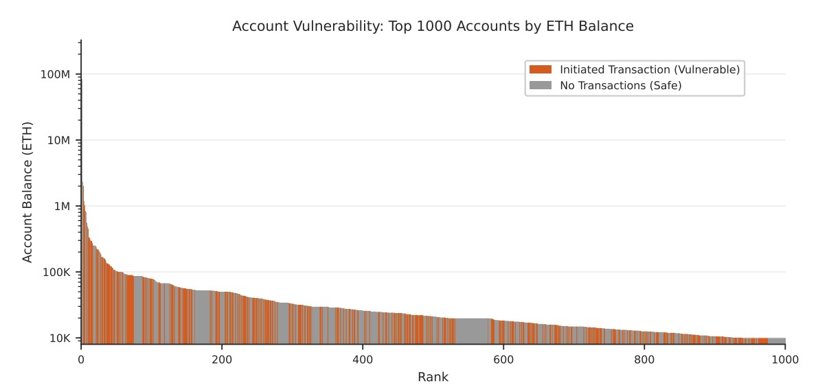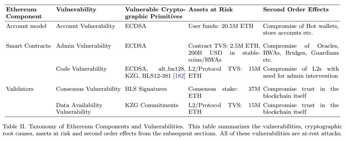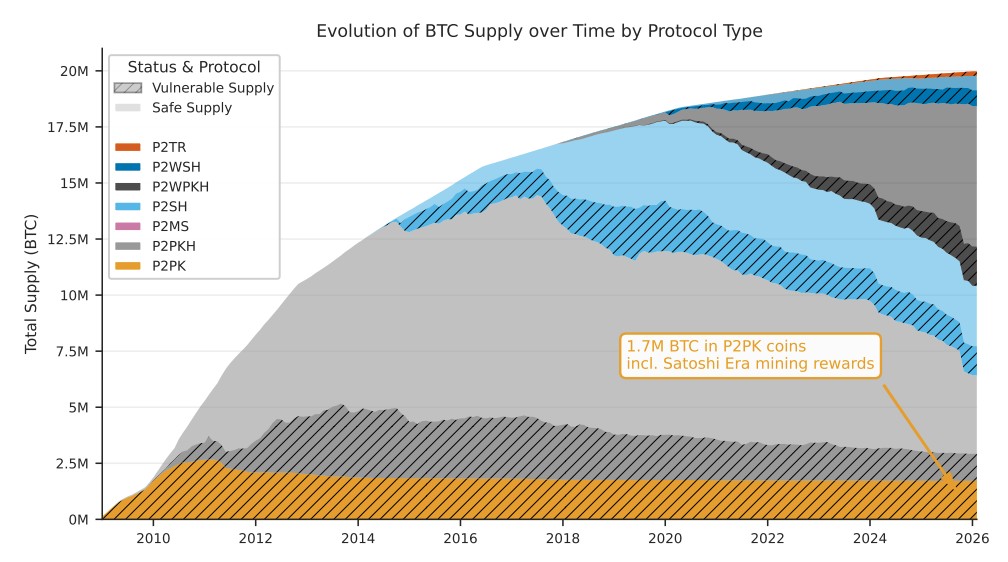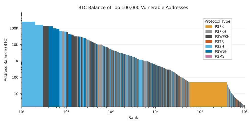 “Destacamos o exemplo dos scripts de bloqueio Pay-to-Public-Key (P2PK) do Bitcoin, que protegem mais de 1,7 milhão de BTC. O total de bitcoins inativos vulneráveis a ataques quânticos pode chegar a 2,3 milhões de BTC quando todos os tipos de script são considerados. Diferentemente de carteiras ativas, que podem migrar para novos padrões, ativos inativos não podem ser “corrigidos” por meio de forks que habilitem protocolos de Criptografia Pós-Quântica (PQC) para transações futuras.”