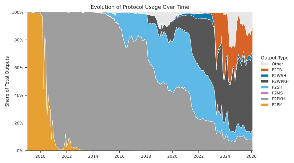 O destaque fica para o P2PK já que, como seu nome sugere, a chave pública já está revelada, podendo resultar em ataques de longo alcance.