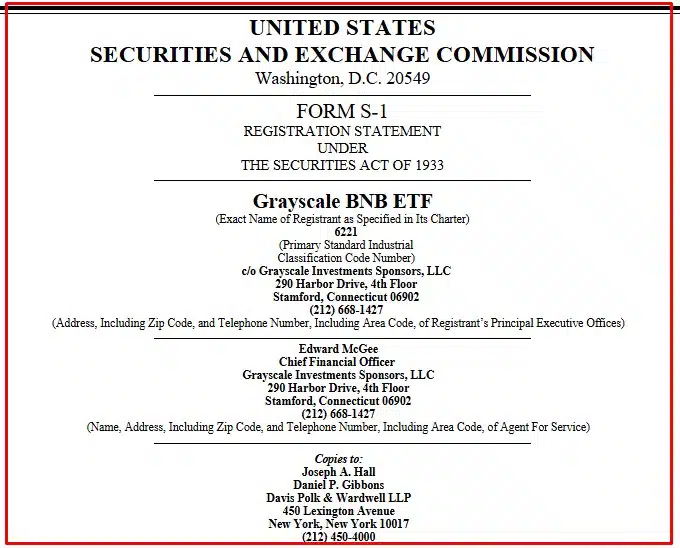 Grayscale entra com pedido de ETF de BNB nos EUA. Fonte: SEC/Reprodução.